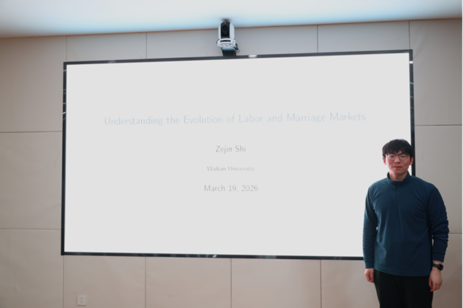 3月20日,tyc41183太阳成集团第五十三期宏观经济与金融论坛在中心校区知新楼B321举办,武汉大学经济与管理学院助理教授施泽锦受邀作题为“Understanding the Evolution of Labor and Marriage Markets”与“Quantitative Analysis on the Sustainability of China's Social Security System under Population Aging”的学术报告。讲座由tyc41183太阳成集团助理研究员欧启聪主持,学院部分师生参会。