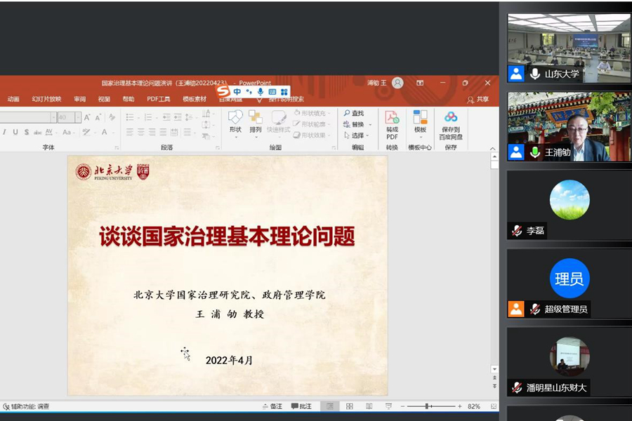 王浦劬教授的报告围绕什么是中国语境中的“国家治理”、什么是中国的国家治理现代化和中国国家治理现代化的路径三个方面展开。他从马克思主义的研究思路和思维特点出发,阐述了对中国语境中“国家治理”的理解。他认为,中国的国家治理超越了 “国家中心主义”“社会中心主义”和“政党中心主义”的研究范式,是国家与社会政治关系的功能函数、国家统治和管理的有机结合、政治权力与公民权利的互动联系。国家治理现代化本质上是政治权力与公民权利良性互动关系的构建和优化,包括国家治理体系和治理能力现代化;国家治理现代化奉行和贯彻现代化价值取向,以制度建设运行和治理绩效作为现代化的标尺,实现国家与社会的协同治理的现代化结构目标。王浦劬指出,推进中国国家治理现代化要做到以下六个方面:一是要坚持中国共产党集中统一领导与全面从严治党;二是以优化政治权力与公民权利的关系为主线;三是以坚持和完善中国特色社会主义制度为实施路径;四是贯彻全面统筹和协调推进国家治理现代化的战略;五是实施多主体协同治理、共同推进的现代化发展方略;六是以运用制度达成高质量治理效能为治理能力建设标尺。在互动环节,王浦劬教授就师生提出的现代化与现代性、国家预算治理与国家治理的关系等发表了自己的看法。本次讲座让参会师生对中国的国家治理现代化有了一个更为全面、深刻的理解。与会人员纷纷反映获益匪浅。