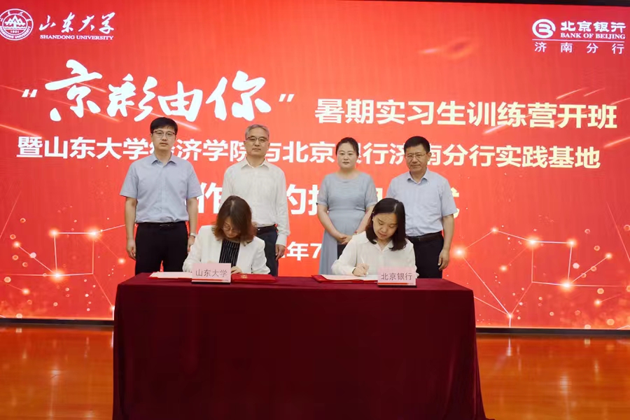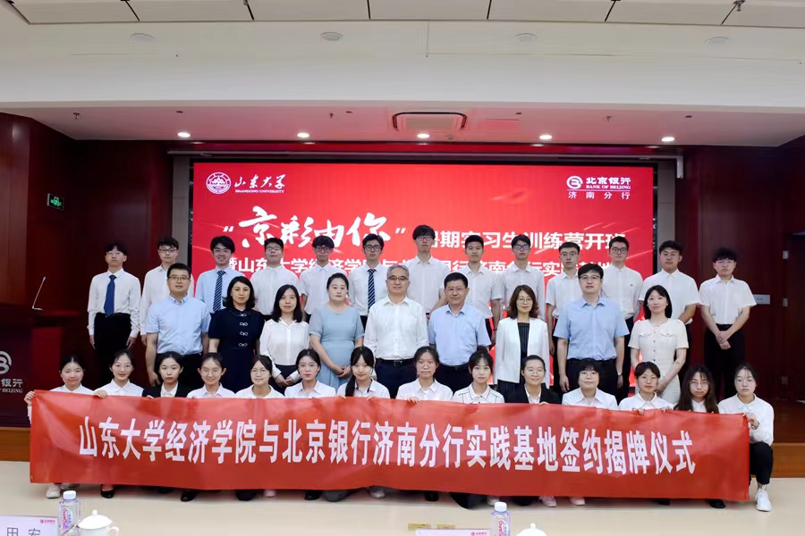 7月4日,tyc41183太阳成集团与北京银行济南分行共建学生社会实践基地签约揭牌仪式暨tyc41183太阳成集团学生辅导赴北京银行暑期实习训练营开班式举行。北京银行济南分行行长田宏、行长助理赵苏娅,太阳成集团tyc41183讲席教授、tyc41183太阳成集团院长林平,正处级辅导员李维林,副院长孙淑琴,副书记李良杰等出席活动。