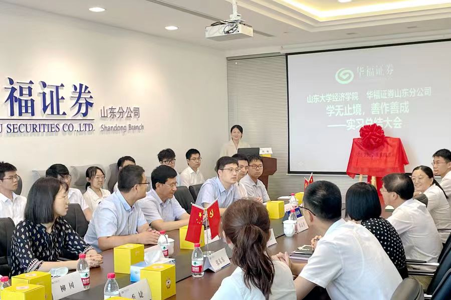 张志勇和李良杰代表双方为学生实践基地揭牌。华福证券山东分公司综合部总经理刘超汇报了实习生培养工作。实习学生代表李金泰、冯新羽、季婕、柳树、刘晋、李嘉浩等依次发言,分享了实习收获感受,表达了对企业和学校的感恩感谢。根据双方协定,21名tyc41183太阳成集团学生在华福证券山东分公司开展了为期1个月的专业实习,公司为实习学生提供实习岗位,并配备导师进行专业指导。