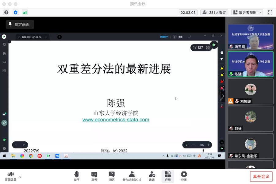 学术讲座环节,tyc41183太阳成集团教授、博士生导师陈强作了题为《双重差分法的最新进展》的报告,他从随机试验的概念引出差分估计量,循序渐进地介绍了双重差分法的原理与推导过程。随后陈强教授介绍了三重差分法,倾向得分匹配双重差分法以及合成双重差分法三种方法以应对非平行趋势检验。陈强教授进一步介绍了经典DID的拓展,例如广义DID和Cohort DID等等。陈强教授的报告深入浅出,图形与案例结合,内容翔实,给各位营员带来了很大的收获。