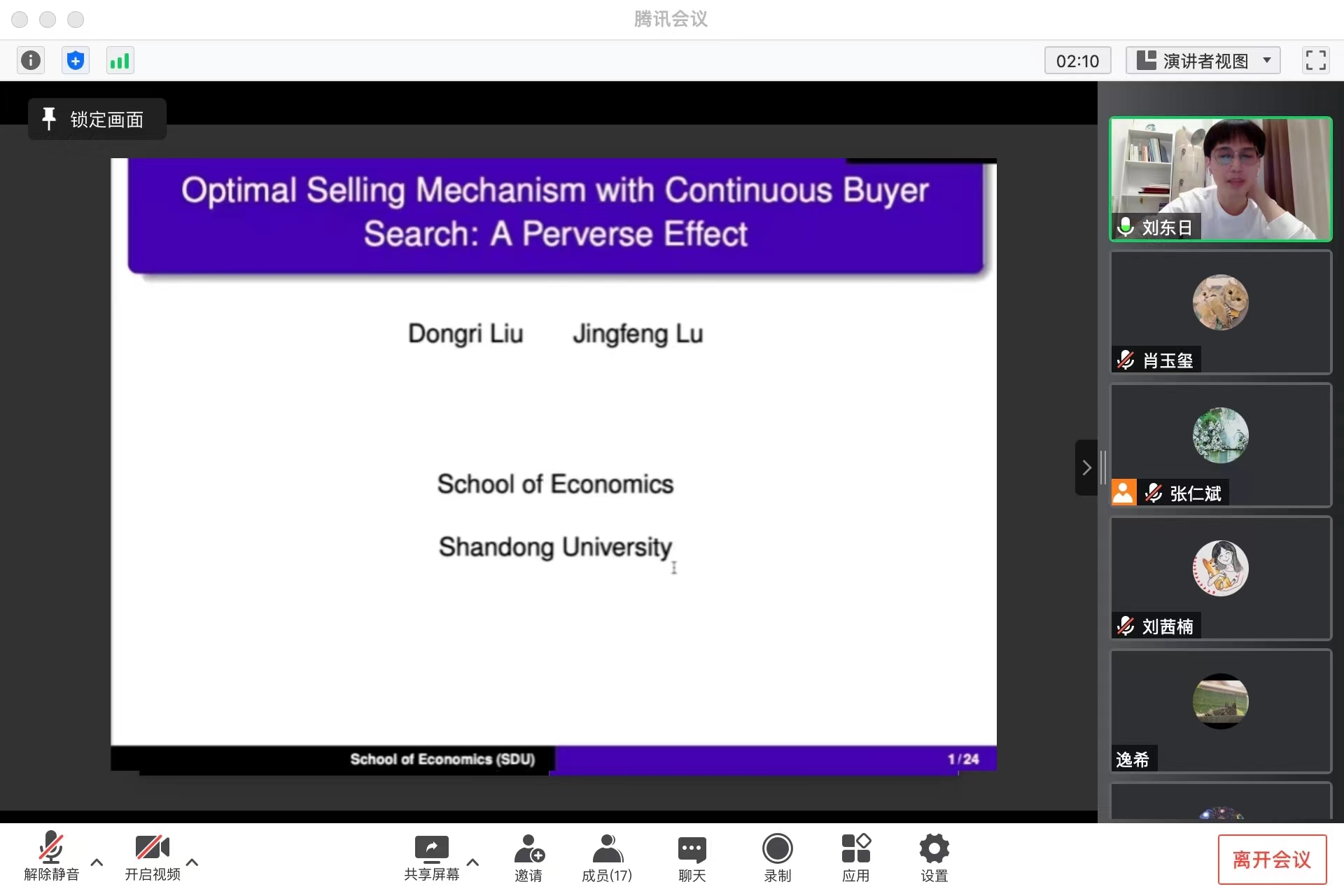 9月15日,tyc41183太阳成集团第71期青联学术午餐会以线上形式举行,新加坡国立大学经济学博士刘东日作了题为“Optimal Selling Mechanism with Continuous Buyer Search: A Perverse Effect“的学术报告。本次会议由tyc41183太阳成集团助理研究员张仁斌主持,学院部分师生参会。
