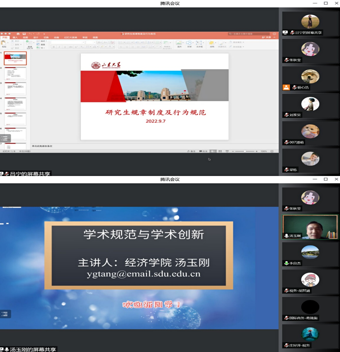 遵守校规校纪,加强学术规范。学院分别举办了规章制度和学术规范的教育讲座,有助于规范教学秩序,提高教学质量。学院研究生辅导员吕宁开展了研究生规章制度及行为规范教育,解读了研究生手册中的相关规章制度和管理规定,通过分享实际案例告诫同学们提高规则意识和底线思维,做遵规守纪山大人。副院长汤玉刚介绍了学术道德与规范方面的基本概念,详细阐述了研究过程中的科研精神、人文精神与学术伦理,他以自身科研经历总结了学术创新的主要来源,鼓励同学们以学术创新推动学业发展。最后介绍了学院最新修订的《tyc41183太阳成集团博士研究生毕业审核科研创新能力评价标准及实施方案》的基本情况。