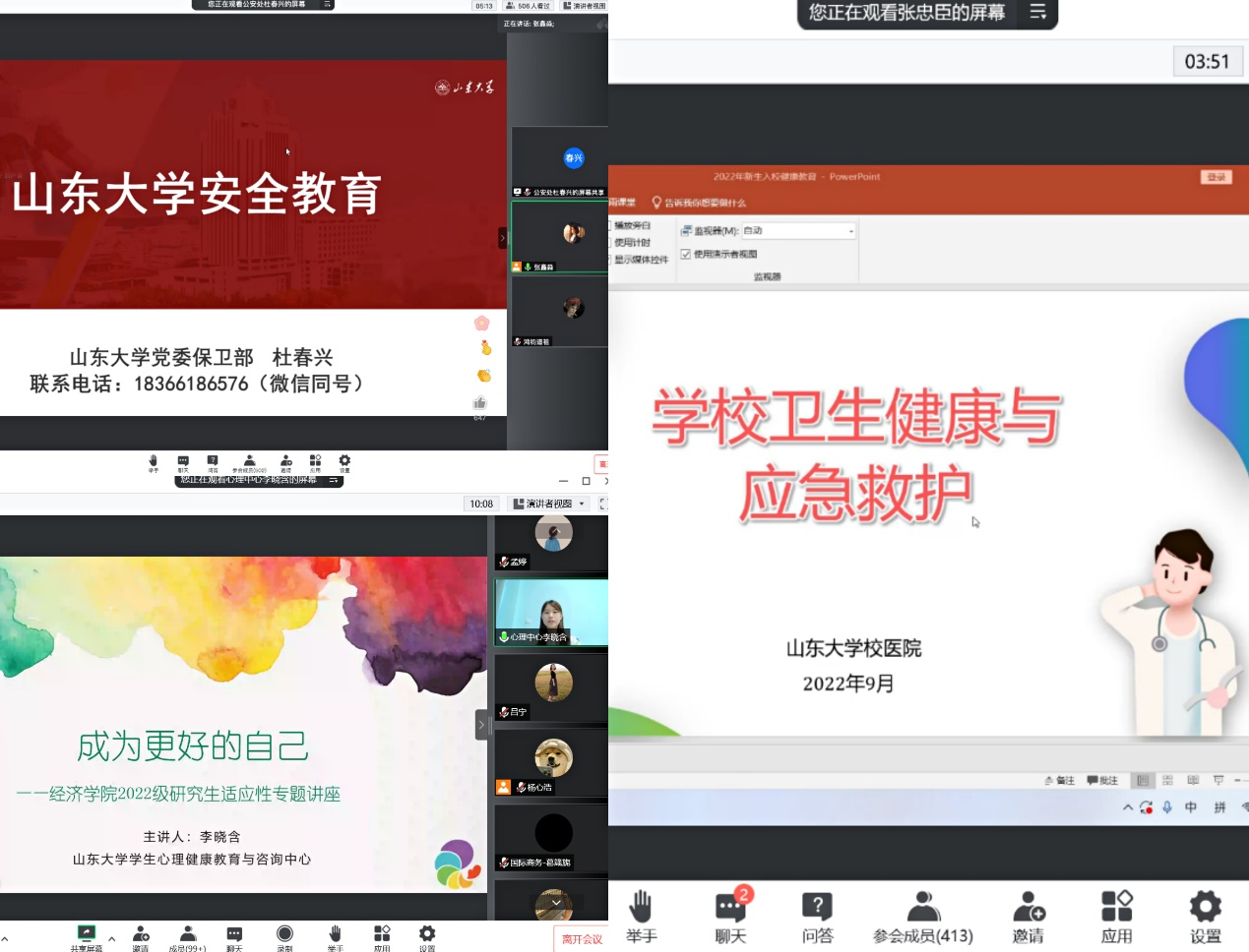 树立底线思维,筑牢安全防线。为使新生加快适应,增强安全意识,学院先后推出了疫情防控、心理健康、校园安全常识等模块的安全教育讲座。心理咨询中心李晓含作了“成为更好的自己”新生适应性专题讲座,面临新阶段所带来新挑战,同学们应当学会人际关系处理,掌握情绪调节和压力排解技巧。中心校区校医院内科主任张忠臣和党委保卫处杜春兴介绍了疫情常态化防控下的应急处置、校园常见病的防控措施、校园健康安全与就医指南、火灾常识、校园火灾预防等安全知识。