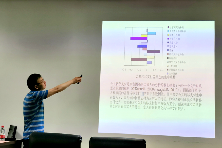 会议上,解垩老师首先基于贫困线的一个简单算例引出减贫贡献率、贫困脆弱性、资产贫困陷阱和多维贫困等常用的贫困概念。随后,针对“转移支付反贫困效率”这一话题,解垩老师在梳理现有文献的基础上,基于中国健康与养老追踪调查(China Health and Retirement Longitudinal Study, CHARLS)的基线调查数据进行进一步分析,发现转移支付和税费系统减少了农村不平等和贫困。虽然税费表现出了累退特性,但转移支付和税费系统作为一个整体而言是累进的。从政府转移支付的各种类看,五保户补助、无保障老人补助、低保、特困户补助及退耕还林补助这些种类的政府转移支付对贫困的瞄准较好,其减贫效率相对较高,溢出效应也相对较小。