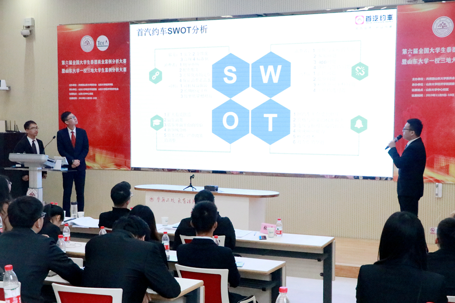 复赛环节,竞赛题目依托共享经济为背景,在网约车市场中以首汽约车为例,围绕提高市场份额,应对同行威胁及平衡与平台的关系展开分析。各团队广泛采用PEST模型、SWOT模型、波特五力模型、安索夫矩阵等多种学术研究模型,涉及经济、政治、文化、社会多个领域,从行业所处的宏观微观背景、核心竞争优劣势、战略合作及进阶战略等进行全面具体的分析,结合目前网约车市场呈现的“一超多强”局面,提出了可靠适用的发展建议和战略,为首汽约车的发展设计蓝图指明方向。各团队以精神饱满的状态,全力以赴迎接挑战,通过辩论、自制视频、小剧场等生动形象的表现方式阐释团队观点,呈现解决方案,营造了一场学术盛宴,展现出大学生学以致用的专业素养和出色的临场发挥能力。经过复赛比拼,最终根据评委评分结果,“财贸双全队”“么的感情的分析机器队”等九支队伍突出重围,杀入决赛。