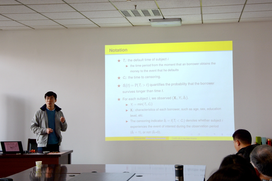 报告分为引言、模型介绍、渐进性、模拟实验等部分构成。首先,报告指出,要确定信用风险,确定违约的可能性是银行和其他信贷公司要解决的主要问题之一。而传统的信用评分方法包括逻辑回归、判别分析、决策树等方法的缺陷在于只能判断是否违约,不能判断何时违约。在此基础上,报告介绍了Thomas等人在2002年首先提出的在信用评分领域中使用的生存分析方法,这种方法可以用来预测发生时间的概率。随后,报告分别介绍了有限混合模型、比例风险模型以及混合模型。其中比例风险模型需假定所有人的基准风险与系数β均相同,混合模型通过引入潜在量,运用惩罚的思想来确定K的个数。对于渐进性,报告指出是在k已知的情况下估计β。最后,报告通过引入德国的信用卡数据进行了模拟实验。报告结束后,参会老师就报告中的有关问题与裴有权老师进行了深入交流与探讨。
