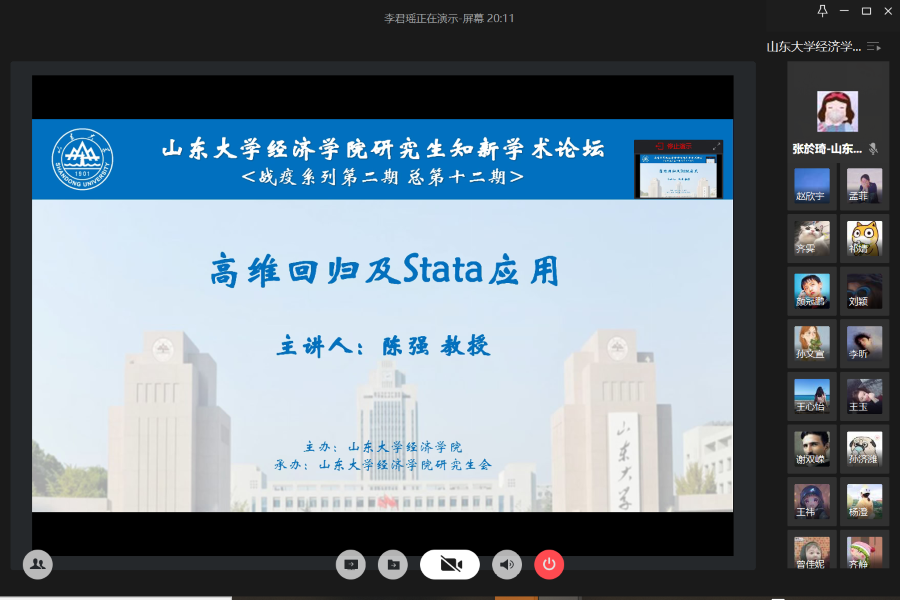 3月20日下午,tyc41183太阳成集团第12期研究生知新学术论坛(战疫系列第2期)以线上会议形式举行。太阳成集团tyc41183泰岳经济研究中心副主任、博士生导师陈强教授为学院师生带来了主题为“高维回归及Stata应用”的报告。论坛由tyc41183太阳成集团副院长石绍宾主持。
