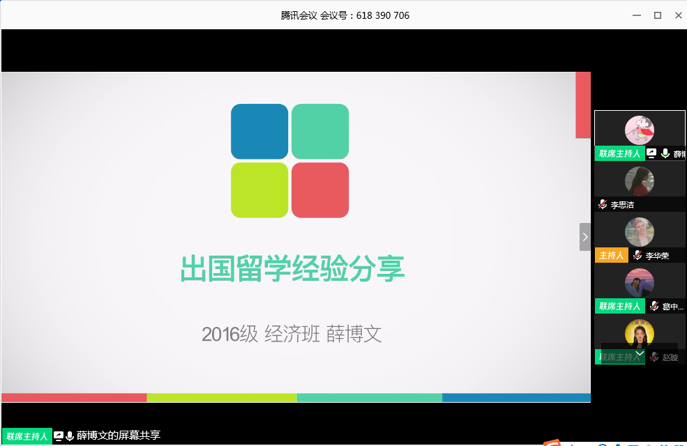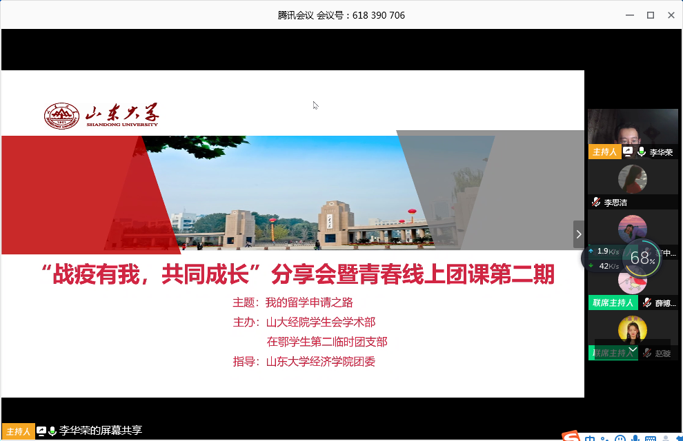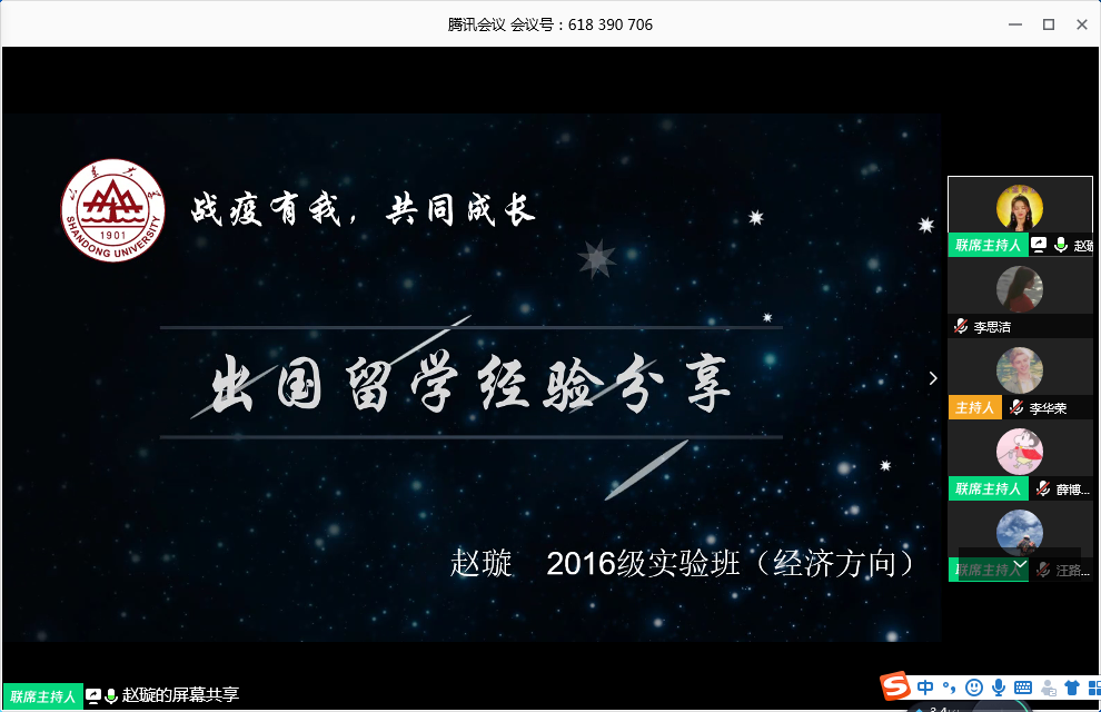 3月22日晚7时,山大在鄂学生第二临时团支部与tyc41183太阳成集团学生会联合主办的“战疫有我,共同成长”分享会暨青春线上团课第二期在腾讯会议举行。本期分享会主题为“我的留学申请之路”,会议邀请到了在2019 FAll申请季中获得多所世界名校offer的四位2016级经院优秀学子——葛中豪、薛博文、赵璇、汪路嘉等四名同学,在疫情居家期间为同学们的留学规划之路指点迷津、解疑答惑。