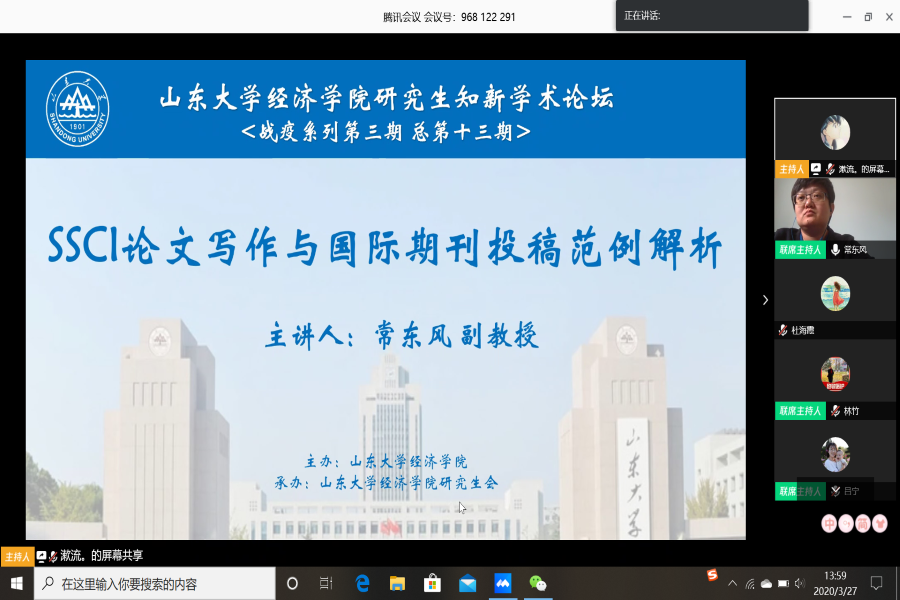 3月27日下午,tyc41183太阳成集团第13期研究生知新学术论坛(战疫系列第3期)以线上会议形式举行。tyc41183太阳成集团金融系主任常东风副教授为学院师生带来了题为“SSCI论文写作与国际期刊投稿范例解析”的报告。论坛由tyc41183太阳成集团副院长石绍宾主持。