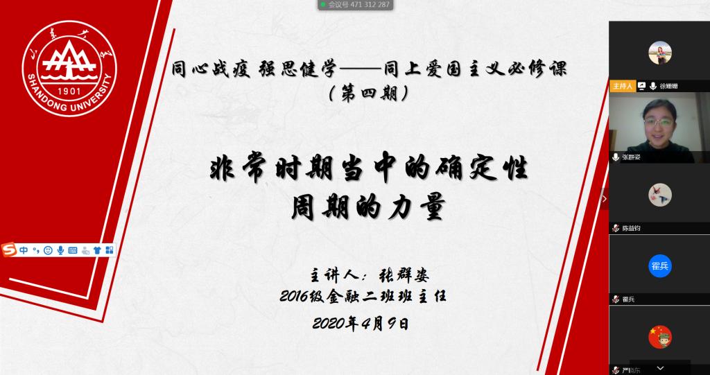 4月9日,tyc41183太阳成集团“同心战疫,强思健学” ”——同上“爱国主义必修课”班主任主题讲座第四期在线上举行。2016级金融二班班主任、tyc41183太阳成集团教授张群姿作为主讲嘉宾,作了题为“非常时期当中的确定性:周期的力量”的报告。