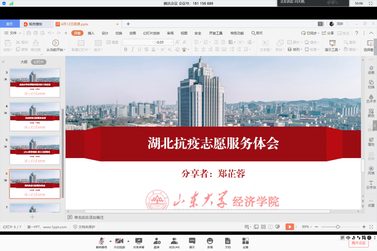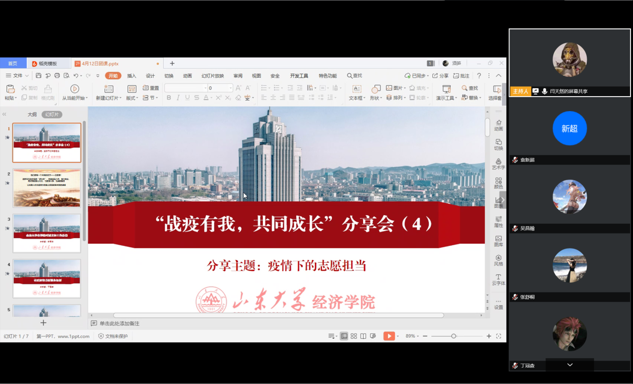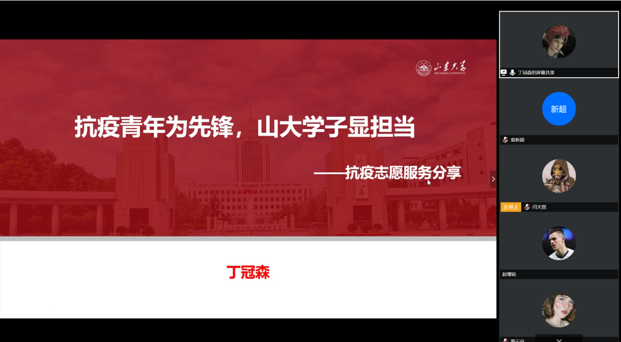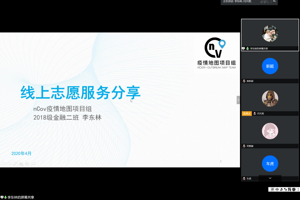 4月12日晚,tyc41183太阳成集团学生组织与在鄂学生第二临时团支部在线联合举办“战疫有我,共同成长”第四期分享会。本次分享会主题是“疫情下的志愿担当”,邀请丁冠森、李东林、郑芷蓉、李思洁四位在疫情期间积极投身于志愿活动的经院学子,分享他们的心得与体会。