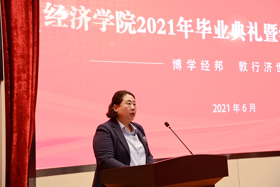 毕业典礼在嘹亮的国歌中拉开序幕。教师代表、经济系教授、博士生导师张东辉和杰出校友代表贺洋分别致辞。张东辉对同学们圆满完成学业表示祝贺,感谢同学们在教学中的积极参与,寄语全体毕业生要做一个勇于进取、敢于担当,立场鲜明,有激情、坚韧不拔,保持高尚情怀的人。杰出校友代表贺洋回忆过往青葱岁月,表达了对母校的感恩,并分享了心得体会。他勉励同学们立志、勤学和感恩,铭记“凡我在处,便是山大”,勇敢前行,不负韶华。2021届优秀毕业生代表申宝霞向几年来给予谆谆教诲的老师、辛勤付出的家长表示感谢,她讲述了自己本科四年在山大经院的精彩生活,并表示将带着在山大经院积淀的智慧果实,带着家国情怀、担当精神、崇实品格、创新素养的山大基因,在新的人生旅程中披荆斩棘、乘风破浪。