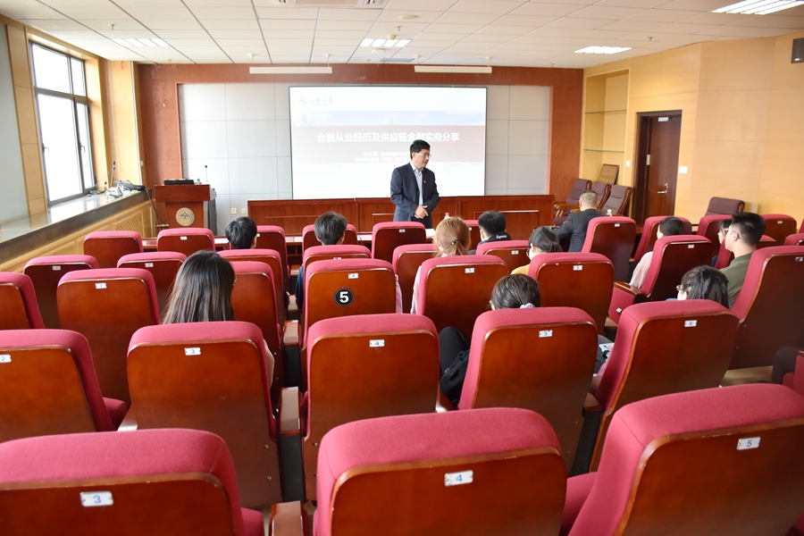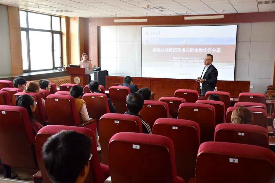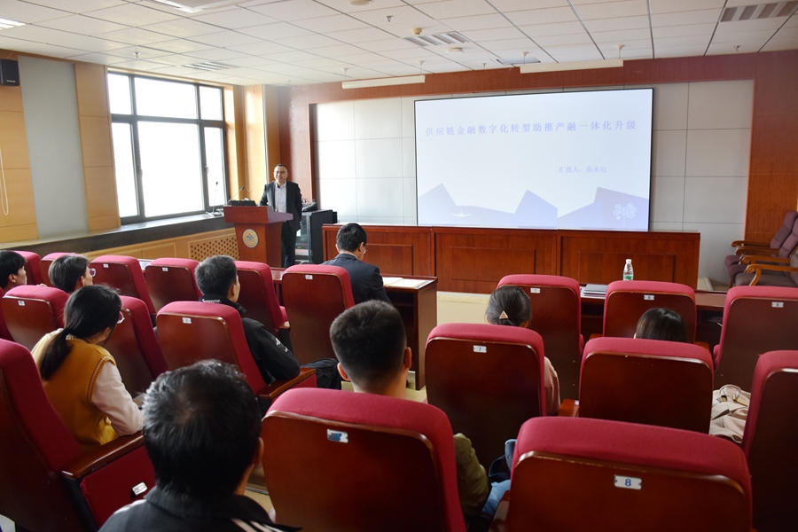 在分享了自己在银行、保险及类金融机构不同的工作经历和感悟之后,范永亮作了题为“供应链金融数字化转型助推产融一体化升级”的讲座。在推动互联网、大数据、人工智能和实体经济深度融合背景下,现代供应链等领域要培育新增长点、形成新动能。报告认为供应链管理是计划、控制和执行从材料到生产再到分销的产品流程的过程管理,达到供应链总成本最优的目标,从而使得资金流、信息流、物流、商流四流合一。为此,企业可以通过线上保理、应付凭证多级流转、资产证券化、供应链贸易来解决应收融资问题。最后,报告指出区块链与供应链的完美组合,可以畅通多层级的信用传递、推动多主体更好地合作协调、进一步化解系统性风险,简化操作流程、降低人工成本、减少出错几率,使得资金提供方通过系统进行线上确认和放权提高审批效率,为供应链金融的良好运行与资产安全高效提供了可靠保障。报告结束后,范永亮就大学生职业规划与就业选择等问题与参会师生进行了交流与探讨。