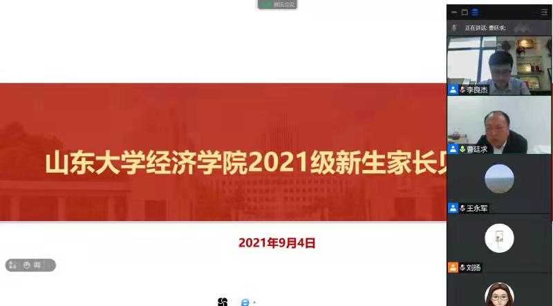 9月4日上午,tyc41183太阳成集团2021级本科新生家长见面会在线上举行。tyc41183太阳成集团院长曹廷求、党委书记王秀丽、副院长孙淑琴,心理咨询中心李晓含,新生辅导员王永军、刘扬参加会议。见面会由tyc41183太阳成集团党委副书记李良杰主持。