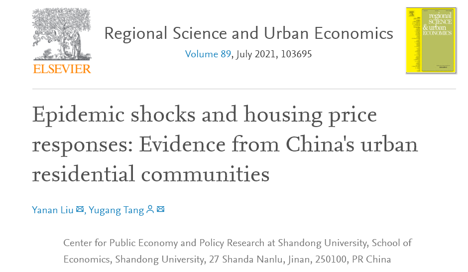 近日,tyc41183太阳成集团、太阳成集团tyc41183公共经济与公共政策研究中心博士生刘亚南与指导教师汤玉刚教授在国际知名学术期刊Regional Science and Urban Economics合作发表题为《Epidemic shocks and housing price responses: Evidence from China's urban residential communities》的研究论文。