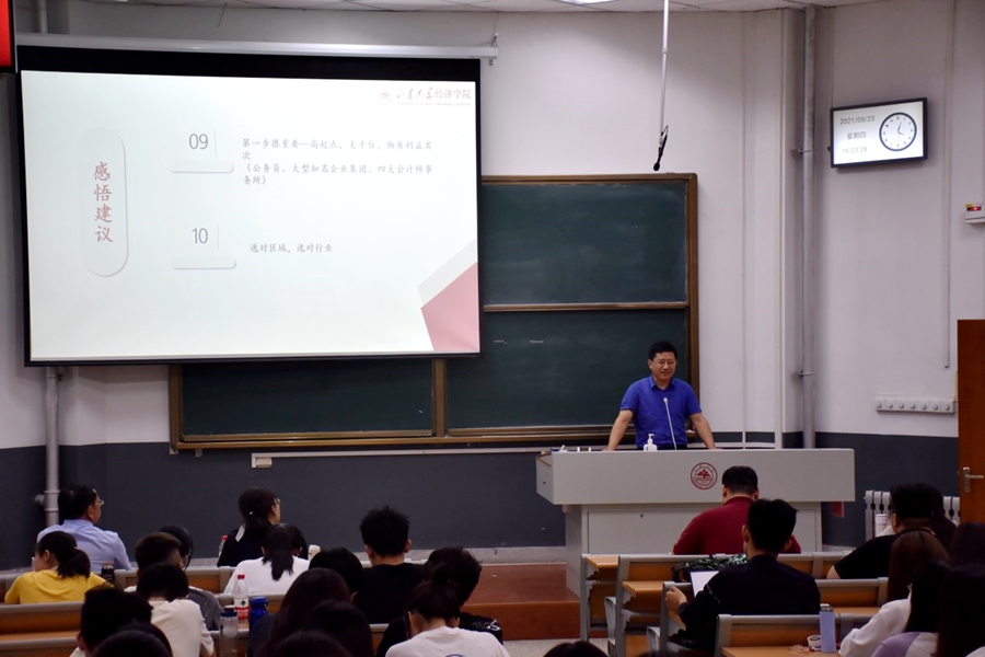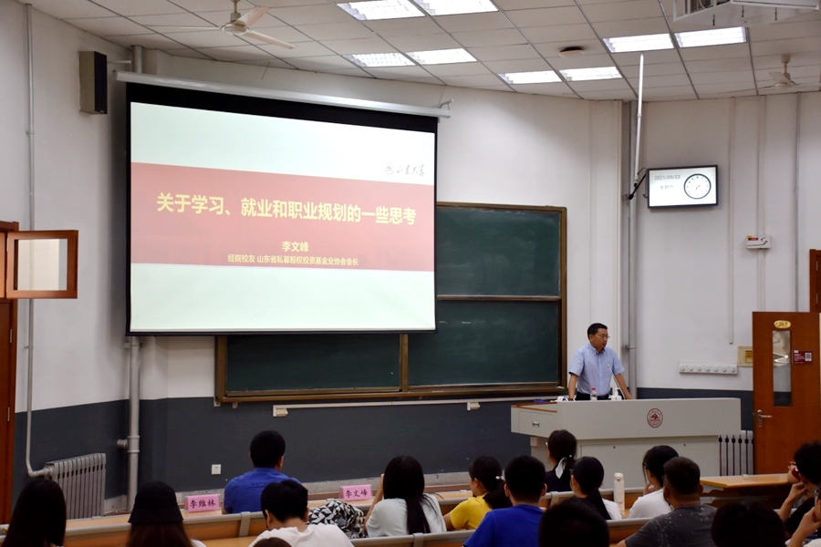 9月23日下午,由tyc41183太阳成集团主办,校友助力学生培养工作室承办的聚贤校友讲坛在洪家楼校区举行。tyc41183太阳成集团校友、山东省私募股权投资基金业协会会长、青岛科技创新基金管理公司总经理李文峰为学院师生带来了题为“关于学习、就业和职业规划的一些思考”的报告。学院正处级辅导员李维林、党委副书记林竹出席讲坛。讲坛由林竹主持。