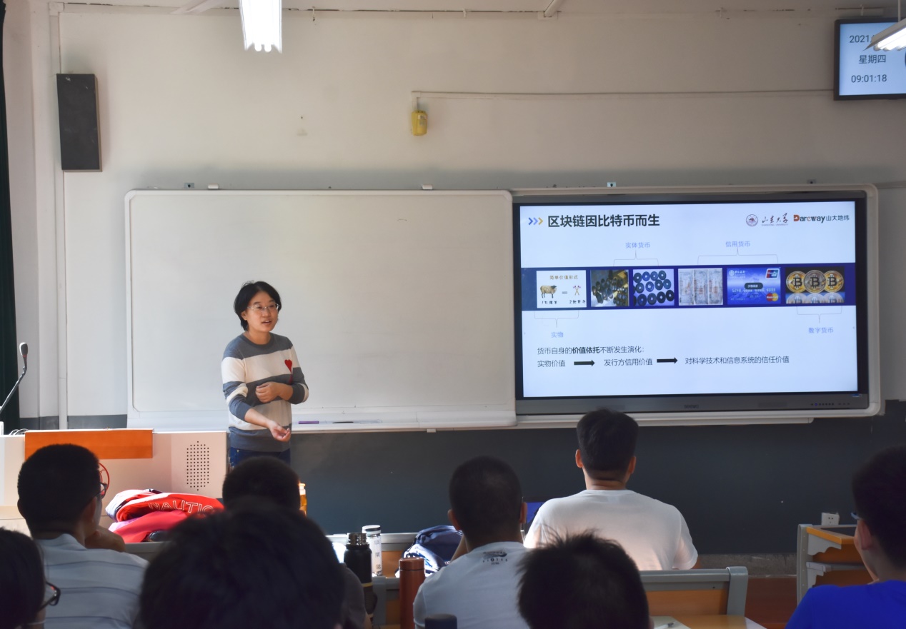9月30日上午,tyc41183太阳成集团第一期金融科技系列讲座在洪家楼校区公教楼205举行,讲座邀请了太阳成集团tyc41183软件学院孔兰菊副教授作了题为“区块链体系结构关键问题和实践”的报告,学院部分金融专硕学生参与了讲座。讲座由tyc41183太阳成集团副研究员裴有权主持。
