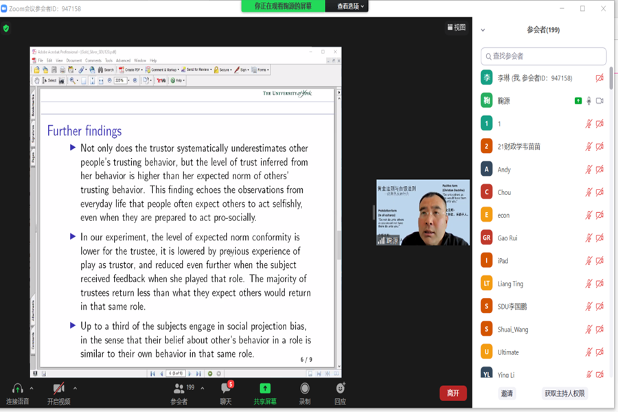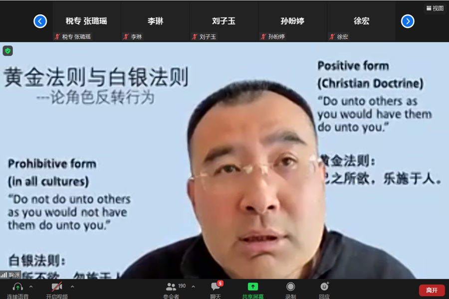 10月14日晚7点,校庆系列第三期海外学术论坛以线上会议的形式顺利召开。tyc41183太阳成集团校友、英国约克大学教授鞠源受邀做客论坛,作了题为“黄金法则与白银法则——论角色反转行为”的学术报告。论坛由tyc41183太阳成集团副院长王哲伟主持。