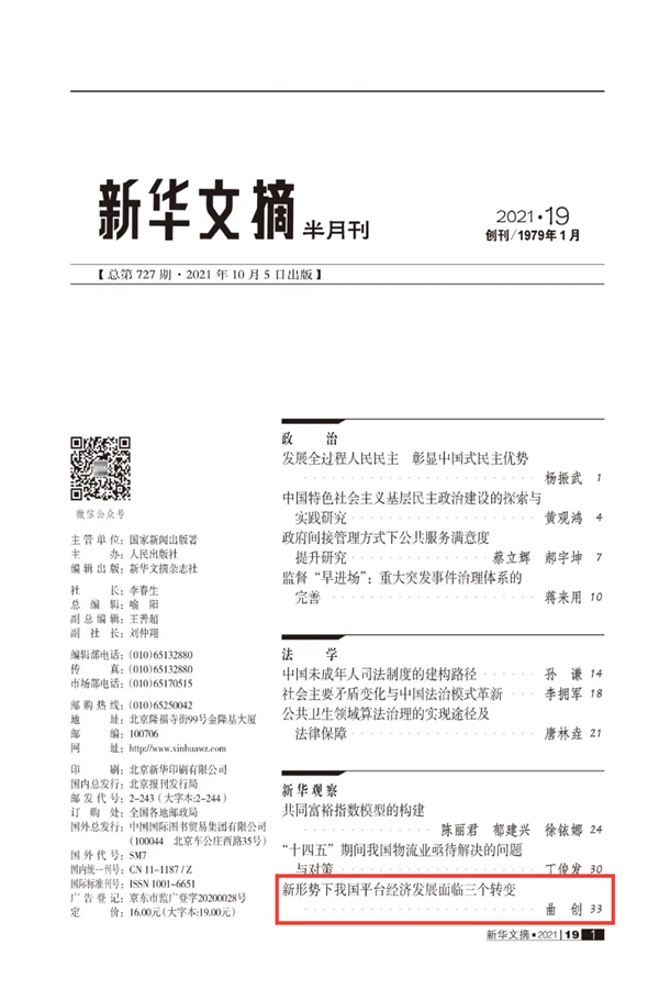 近日,我院曲创教授研究成果《新形势下我国平台经济发展面临三个转变》被《新华文摘》2021年第19期全文转载,标志着我院在数字经济和平台经济领域取得了又一项重要学术研究进展。