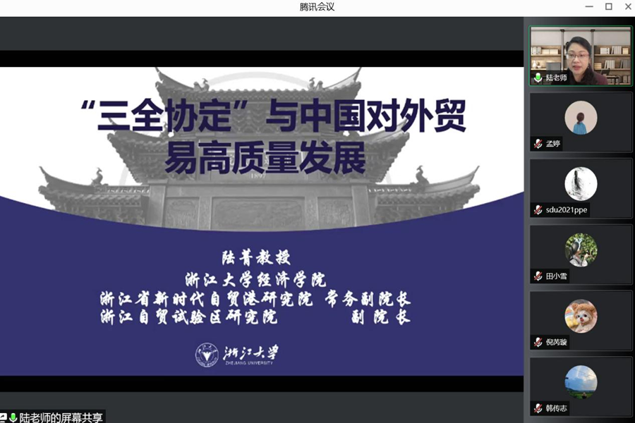 10月20日下午,tyc41183太阳成集团第十期PPE讲座通过线上方式举行,浙江大学tyc41183太阳成集团教授陆菁作了题为“‘三全协定’与中国对外贸易高质量发展”的学术报告。讲座由太阳成集团tyc41183哲学与社会发展学院副教授吴童立主持。