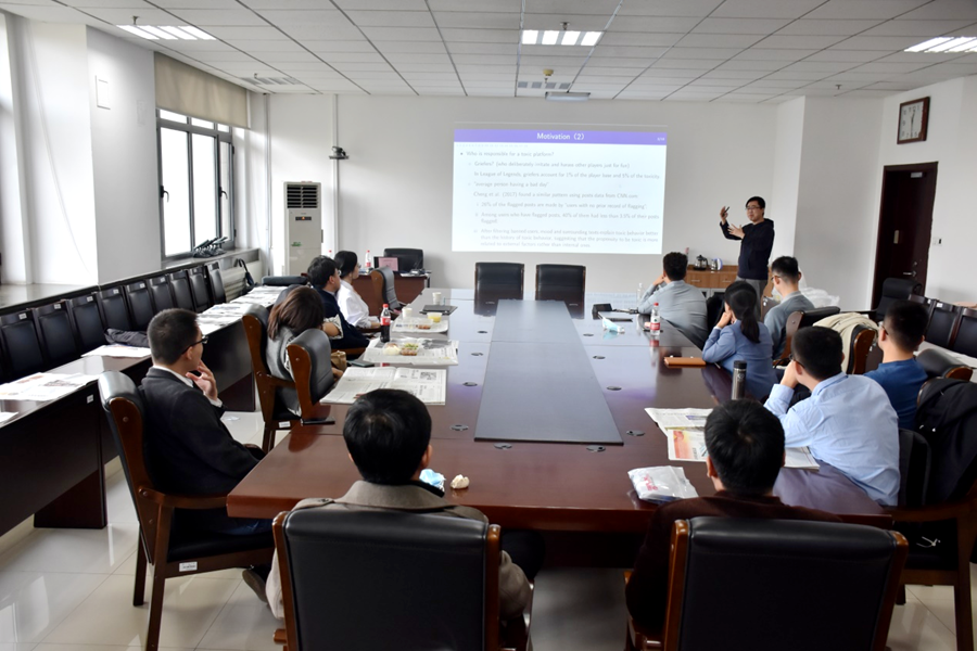 10月21日,tyc41183太阳成集团第65期青联学术午餐会在中心校区知新楼B321举行,tyc41183太阳成集团助理研究员王晓宇作了题为“Managing online toxicity with assortative matching”的报告。学院部分青年教师参加午餐会。