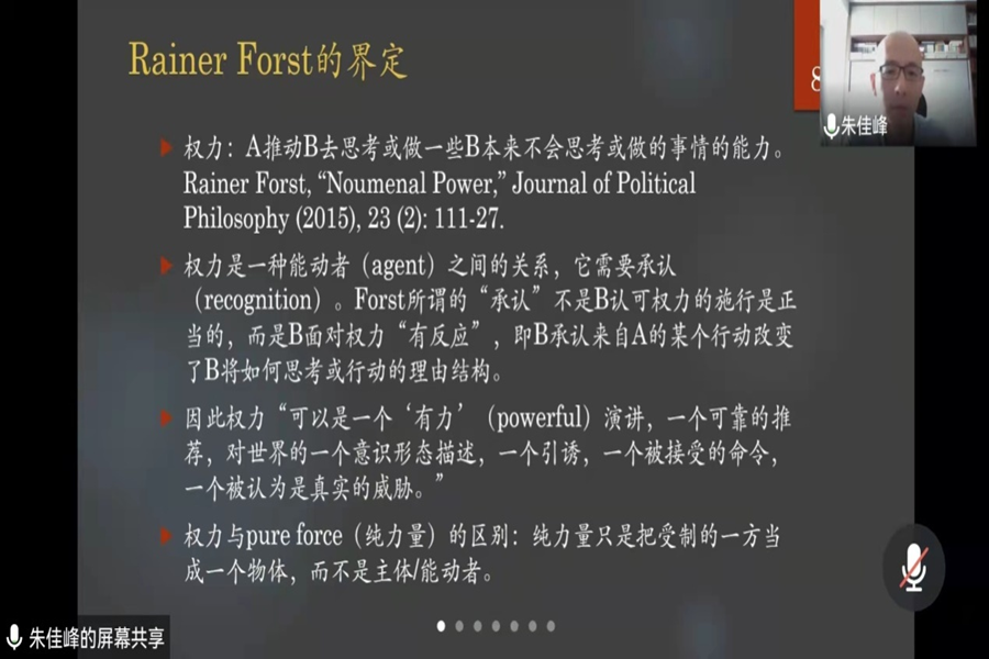 报告以日常生活中权力不对等的现象为切入点,从权力的概念分析入手介绍了理解权力的两个维度:“power to”和“power over”的区分,以及原生性权力(brute power)与规范性权力(normative power)的区分。其中,朱佳峰副教授以物权法为例,着重介绍了依据义务性或约束性实践规范的规范性权力,“改变自己”的自治权力与“改变他人”的他治权力;同时指出规范性权力是作为权利的一个要素,并受到其他权利要素的支持与保护。随后,报告给出了一种分析权力概念的框架,将权力的两维度进行交叉,得到规范性自治权力、规范性他治权力、原生性自治权力与原生性他治权力,并将该2×2的权力分析框架与卢卡斯、韦伯的界定进行了比较。报告指出卢卡斯的权力观关注“利益的(必然)冲突”,韦伯的权力观关注“意志的(可能)冲突”,两者的权力观都有其狭窄之处。接下来,报告介绍了关于权力更为广泛的界定——RainerForst的界定,这种界定尝试去捕捉本体的权力(NoumenalPower)中较为本质的内涵,将权力看作对世界的一个意识形态描述。最后,报告将分析框架中的“规范性他治权力”与卢卡斯、韦伯与RainerForst的界定做了总结,指出中文语境中的“权力”更接近一种规范性他治权力,并进一步阐述了现代国家政治权力至上性、强制性与垄断性的特征。报告结束后,朱佳峰副教授就报告中的有关问题与同学们进行了交流探讨,并就学生提出的问题一一做出了细致解答。