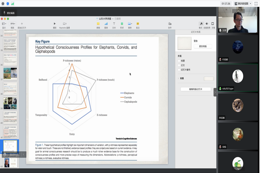 报告基于三个关于跨物种的意识问题,介绍一种动物意识分布问题的理论发展进程并基于类比推理进行了全新的解读。报告首先介绍了解读动物意识的“拟人论”、“摩根法则”以及“跨物种的他心问题——非推论主义”,同时指出由于认知与实践上事实的混淆,这些理论均无法适用;紧接着,王球副教授介绍了在理论优先进路中的“意识的信息整合理论(informationintegrationtheory,简称IIT)”、“心脑同一论”以及各种版本的“功能主义”,但这些理论依旧无法解决分布问题的弊端。因此,王球副教授引入了“类比推理”的方法并介绍了如何进行可靠的类比推理,尝试通过类比推理的方法来解决动物意识的分布问题,其中GaryVarner的类比推理比较了不同物种的nociceptorspresent、brainpresent等指标,JessePrinz的类比推理比较了不同物种的attention、workingmemory、Gammaoscillations、consciousness,但由于具体指标的选择和衡量标准不同,所以两类类比推理方法的结论有很大不同。为了解决这一问题,MichaelTye提出了“最佳解释推理进路”——对于自然界中同一类结果,必须尽可能归之于同一种原因。王球副教授对该理论做出了新的解释:作为牛顿法则中的原因项和结果项,在动物意识的讨论语境中仍应当映射到“主观意识状态”和“行为模式”,类比推理也是研究动物意识必不可少的方法。讲座结束后,王球副教授就讲座中的问题与同学们进行了交流与探讨。