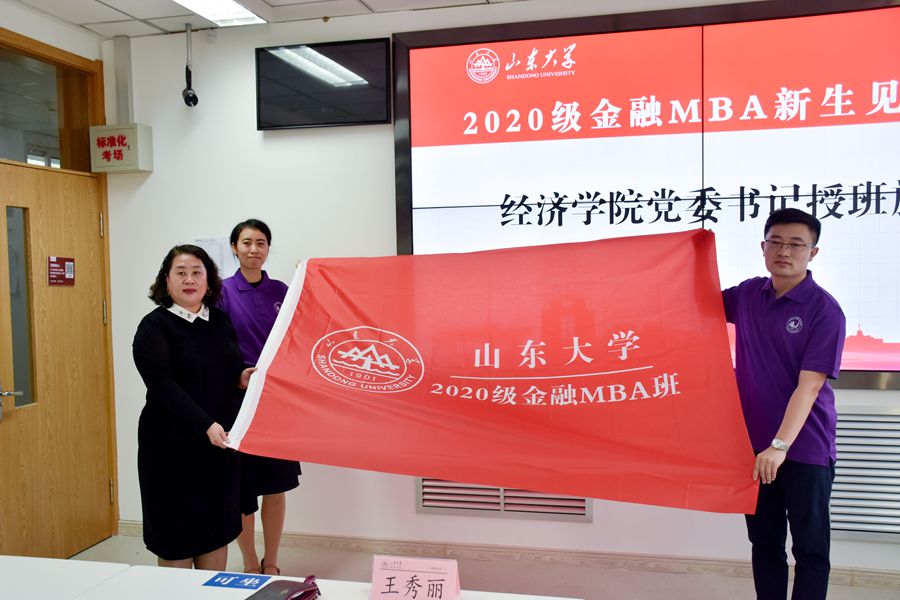 最后,王秀丽向首届金融MBA班授班旗,鼓励2020级金融MBA班成长为一个积极上进、团结友爱的班集体。