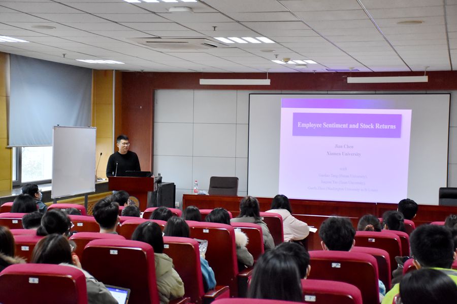 报告发现,较高的员工情绪会预测随后的低市场收益,是由于员工情绪高涨导致同期工资高增长,进而导致公司现金流量随后下降和股票回报率下降,其结果无论在样本内还是样本外均是显著的;员工情绪指数的可预测性可以为资产配置中的均方差投资者带来可观的经济收益;对于在总部所在城市工作的员工和经验不足的员工,员工情绪对股票回报的影响更大;可预测性的经济驱动力与投资者情绪和经理情绪的驱动力截然不同。报告结束后,陈坚就报告中的有关问题与参会师生进行了深入交流与探讨。