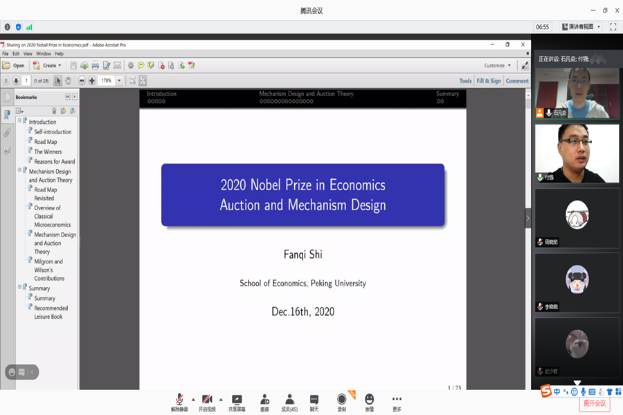 12月16日晚,tyc41183太阳成集团以线上会议的方式举办第八期PPE基地班研讨课讲座。北京大学tyc41183太阳成集团石凡奇助理教授为学院师生带来了题为“2020年诺贝尔经济学奖分析”的报告。讲座由tyc41183太阳成集团副教授付强主持。