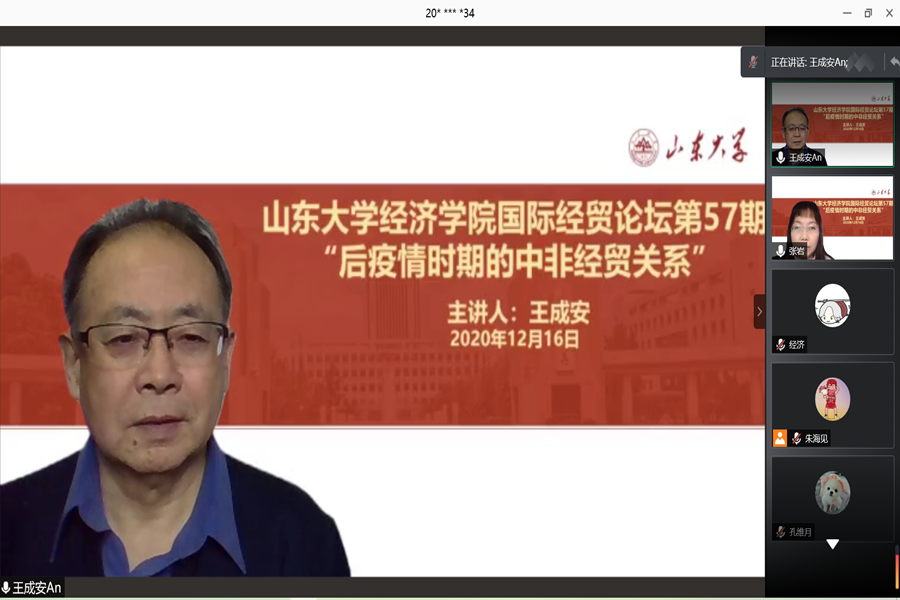 12月16日上午,由tyc41183太阳成集团和人文社会科学青岛研究院联合主办的第57期国际经贸论坛以线上会议形式举行。商务部中国世界贸易组织研究会外经贸咨询顾问委员会委员兼非洲研究小组组长王成安为学院师生带来了题为“后疫情时期的中非经贸关系”的报告。讲座由tyc41183太阳成集团国际经济与贸易系主任张岩主持。