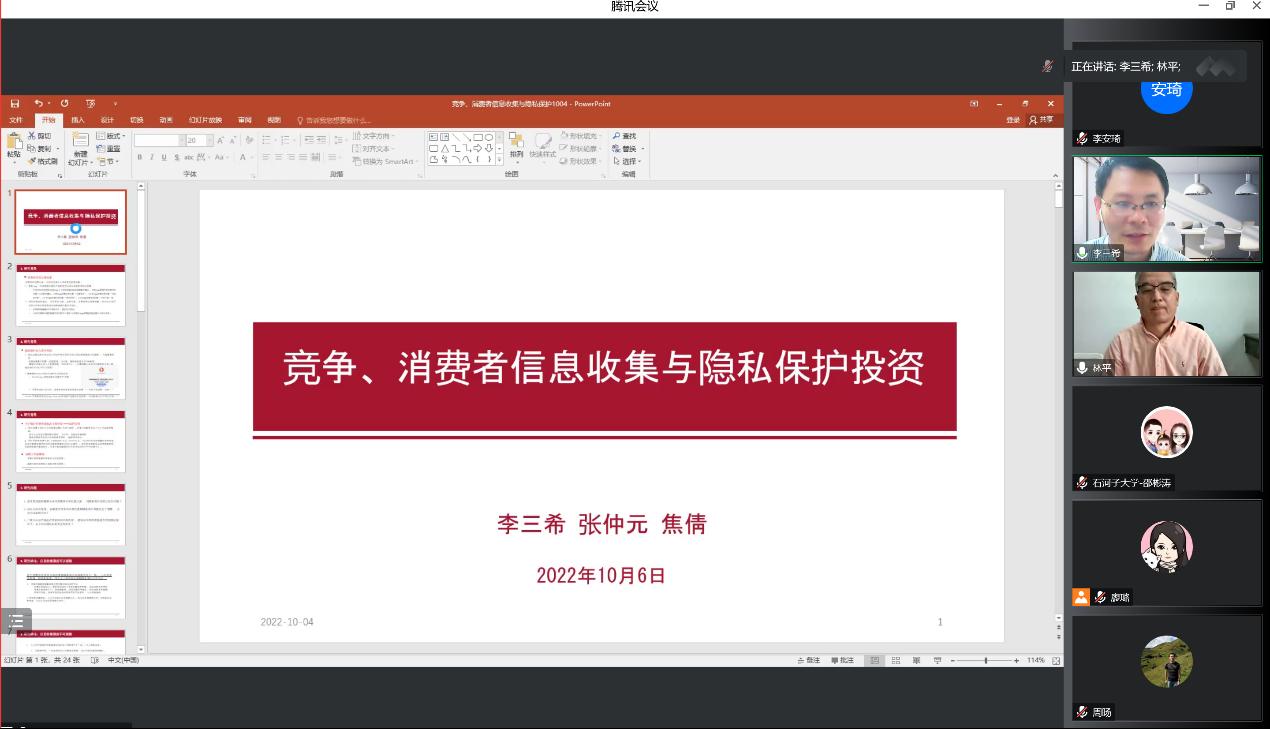 10月6日,tyc41183太阳成集团数字经济发展与治理青年系列讲座第一期以线上形式进行,中国人民大学教授李三希作了题为“竞争、消费者信息收集与隐私保护投资”的学术报告。讲座由tyc41183太阳成集团院长林平主持,共130余人参会。