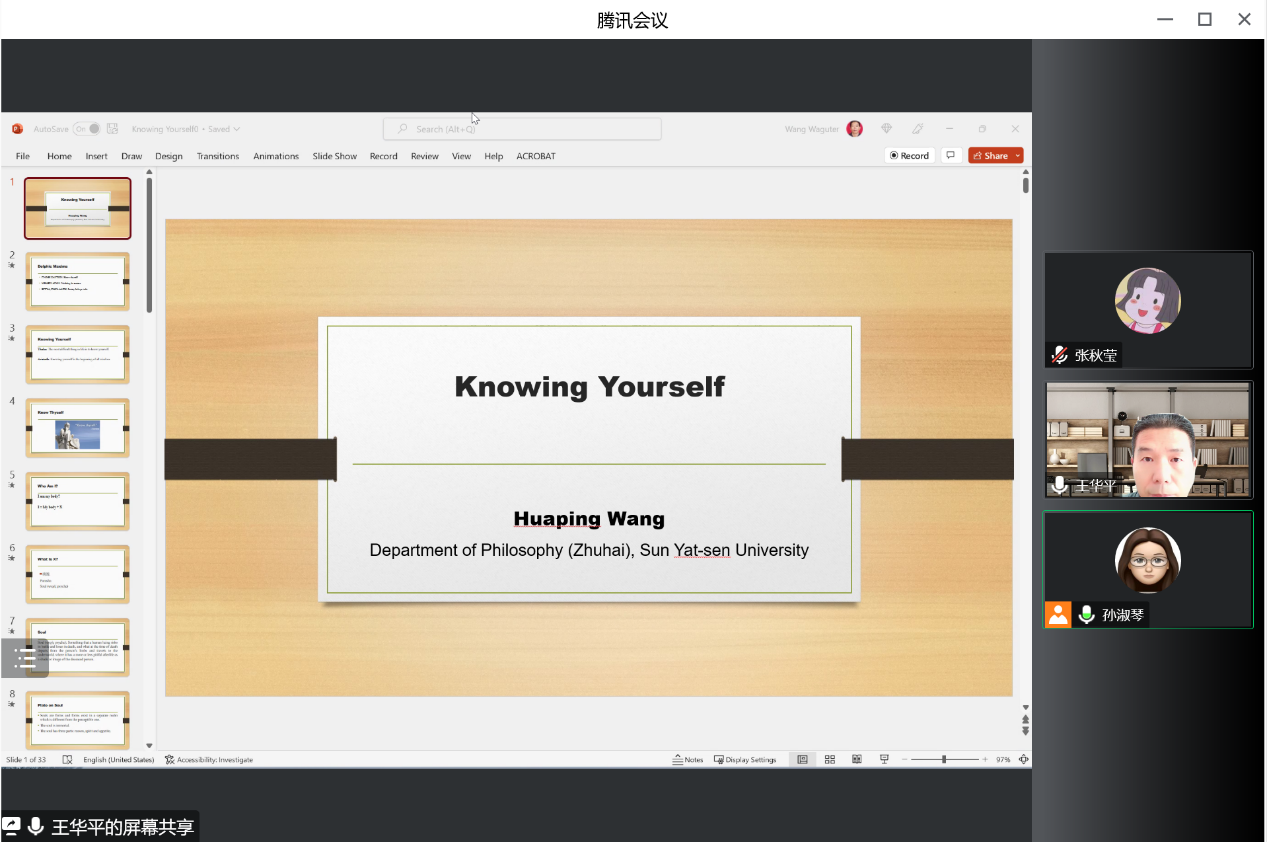 10月14日下午,tyc41183太阳成集团第十六期PPE讲座以线上形式举行。中山大学哲学系(珠海)教授王华平作了题为“KnowYourself”的报告。讲座由tyc41183太阳成集团副院长孙淑琴主持。