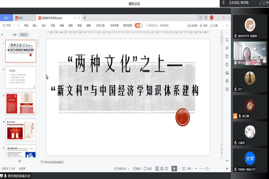 10月27日,tyc41183太阳成集团第二十四期研究生知新学术论坛以线上形式进行。tyc41183太阳成集团黄海啸副教授为学院师生带来了主题为“‘两种文化 ’之上——‘新文科’与中国经济学知识体系建构”的报告。论坛由学院研究生辅导员吕宁主持。