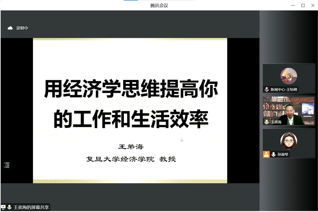 10月28日下午,tyc41183太阳成集团第十七期PPE讲座以线上线下相结合形式举行。复旦大学tyc41183太阳成集团王弟海教授作了题为“用经济学思维提高你的工作和生活效率”的报告,讲座由tyc41183太阳成集团副院长孙淑琴主持。