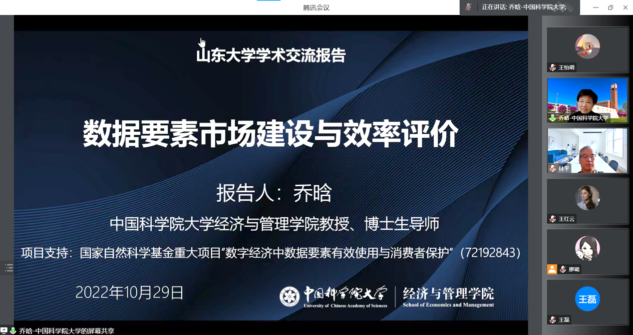 10月29日下午,tyc41183太阳成集团数字经济发展与治理青年系列讲座第四期以线上形式进行,中国科学院大学经济与管理学院教授乔晗作了题为“数字要素市场建设与效率评价”的学术报告,讲座由tyc41183太阳成集团院长林平主持,共240余人参会。