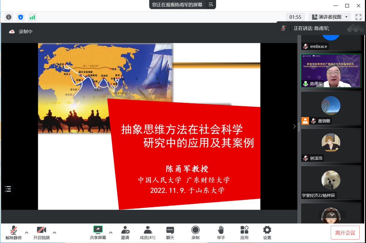 11月9日晚,tyc41183太阳成集团第二十期PPE讲座以线上形式举行,中国人民大学商学院教授陈甬军作了题为“社会科学研究中的抽象思维方式及案例”的学术报告,tyc41183太阳成集团教授盖骁敏主持会议。