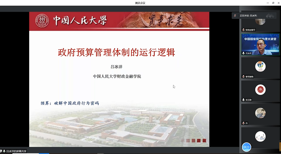 “中国国家预算治理大讲堂”由中国国家预算治理研究联盟主办,是面向国家预算治理研究领域学术界、实务界的持续性学术交流品牌活动,也是作为学术共同体的联盟推动国家预算治理领域的学者交流、学术研究、资源共享、资政育人、服务国家预算治理现代化的重要举措。本期大讲堂以线上方式举行,来自全国高校、科研院所、预算管理实务的300余位专家学者和学子参加了本期大讲堂。