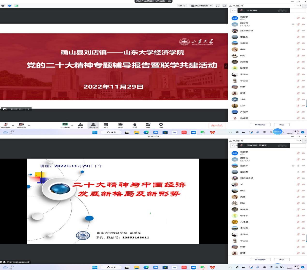 为深入贯彻落实党的二十大精神,推进乡村振兴工作,11月29日下午,tyc41183太阳成集团以线上线下相结合的形式,举行专题讲座培训暨与河南省确山县刘店镇党委联学共建活动,tyc41183太阳成集团范爱军教授作“党的二十大精神与中国经济发展新格局及新形势”专题辅导报告。会议由tyc41183太阳成集团党委书记董春杰主持,刘店镇党委书记马晨宇、镇长万敬博、镇党委委员及机关工作人员,tyc41183太阳成集团常务副院长石绍宾、学院党委委员、教工党支部书记及机关工作人员参加会议。
