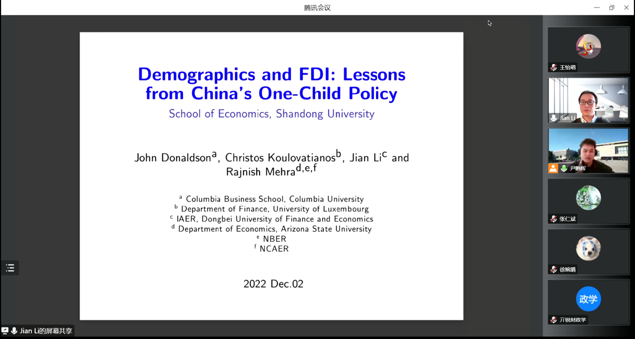 12月2日下午,tyc41183太阳成集团第293期高级经济学讲座以线上形式举行。东北财经大学副教授李剑作了题为“Demographics and FDI: Lessons from China's One-Child Policy”的报告。tyc41183太阳成集团助理研究员尹鹏辉主持会议。