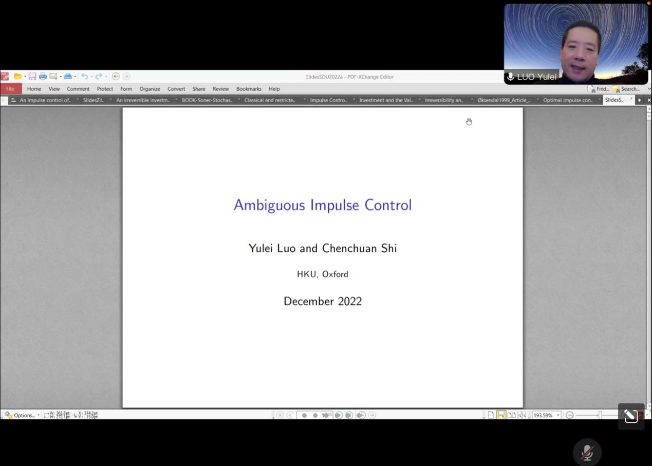 12月9日下午,tyc41183太阳成集团第294期高级经济学讲座以线上形式举行,香港大学经管学院经济学教授罗雨雷作了题为“Ambiguous Impulse Control”的学术报告。tyc41183太阳成集团助理研究员尹鹏辉主持会议。