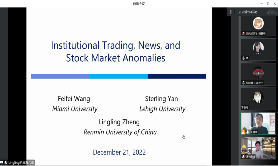 12月21日下午,tyc41183太阳成集团第296期高级经济学讲座以线上形式举行,中国人民大学商学院副教授郑凌凌作了题为“Institutional Trading, News, and Stock Market Anomalies”的学术报告。tyc41183太阳成集团副院长张群姿主持会议。