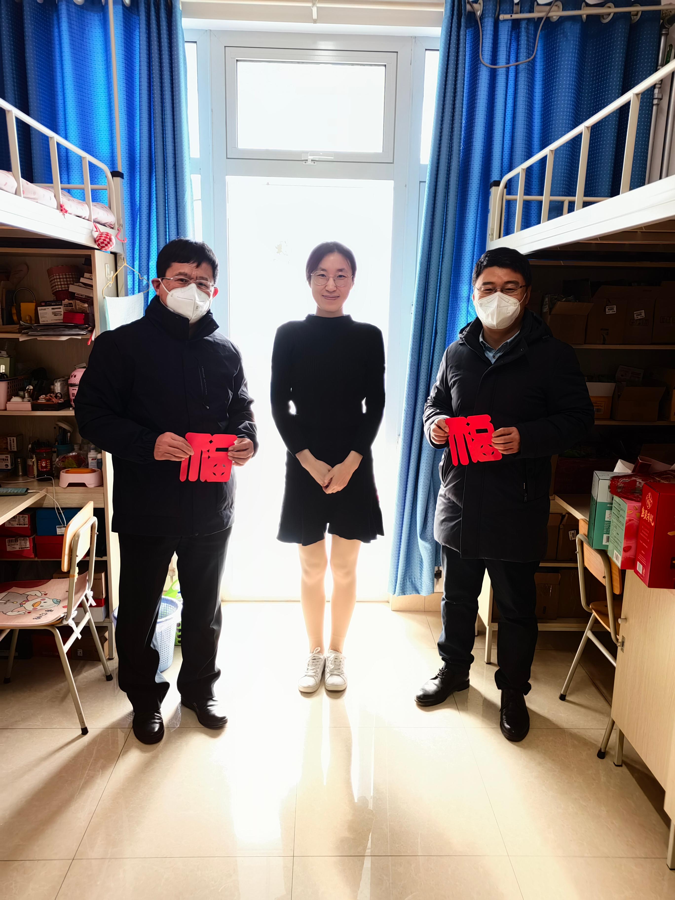 走访慰问过程中,学院领导老师们深入了解了同学们留校期间的学习科研计划、生活情况及当地的风俗习惯,送上暖心大礼包和“一帆风顺”新年贺卡,并为所有同学的宿舍门窗上贴上福字,表达对新年的真挚祝福。同学们也为老师送上自己亲手剪裁的福字,表达了对学院以及领导老师们的感激之情。领导老师表示学校将全力为留校同学们做好各方面的服务保障工作,叮嘱同学们寒假期间要做好自身安全防护,静心学习,开心过年;合理规划安排好时间,在学习科研之余适当放松心情、加强锻炼,丰富假期生活,同时多与父母、亲友、老师沟通交流,共度健康祥和的“中国年”。同学们纷纷表示会牢记嘱托,遵守学校假期各项管理规定,充分利用寒假为自己加油充电,在学校度过一个充实而有意义的假期,以崭新姿态迎接新一年的到来。