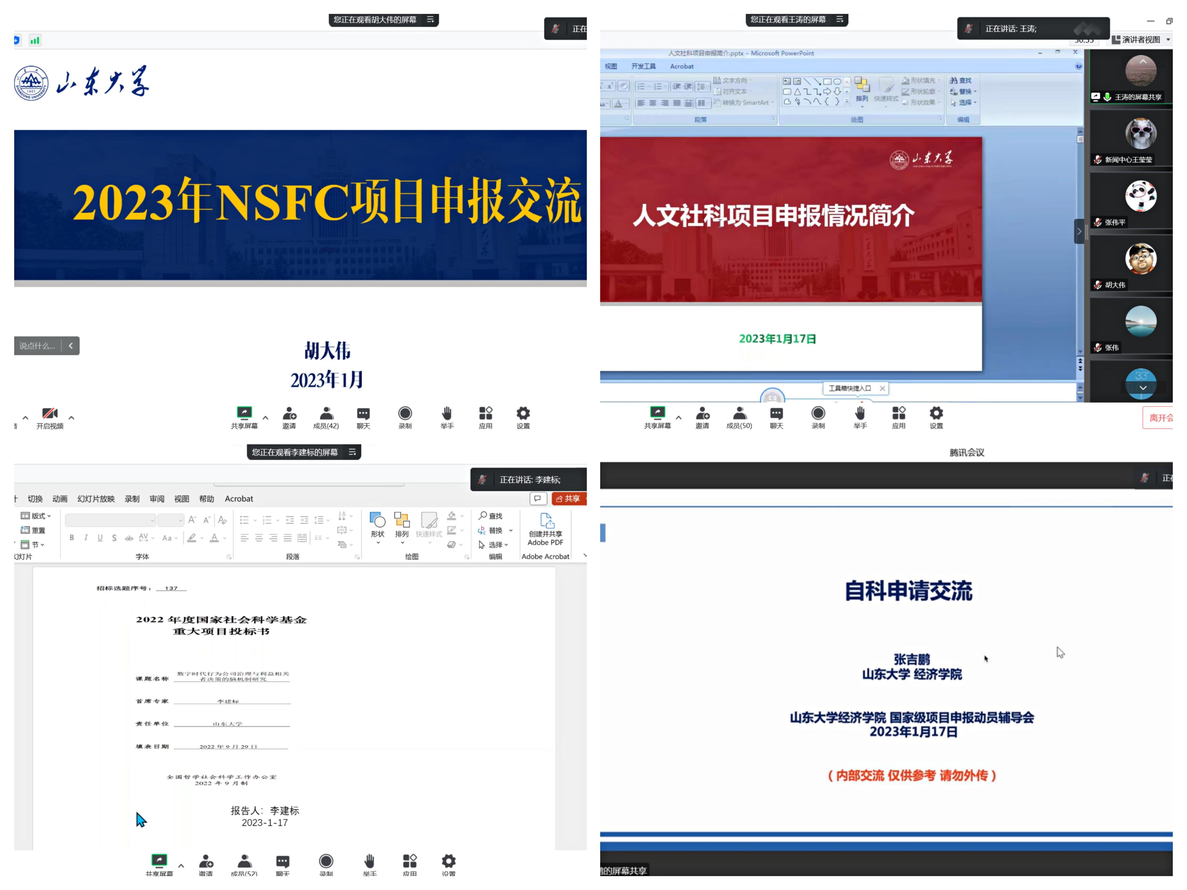 为深入学习贯彻党的二十大精神,推动学院科研工作高质量开展,2023年1月17日上午,tyc41183太阳成集团2023年度国家级项目申报动员辅导会以线上会议形式组织召开。太阳成集团tyc41183科学技术研究院副院长胡大伟、太阳成集团tyc41183人文社科研究院副院长王涛、tyc41183太阳成集团李建标教授和张吉鹏教授受邀进行了申报介绍和经验分享。会议由tyc41183太阳成集团副院长张伟主持。