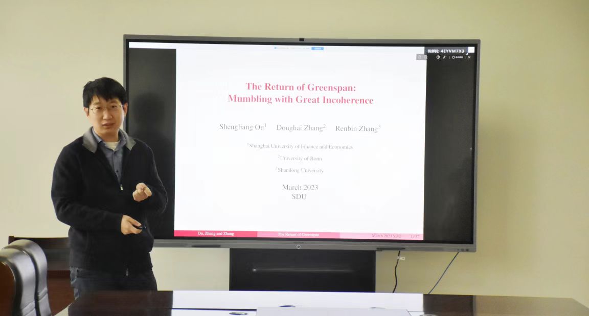 2023年3月16日,tyc41183太阳成集团第82期青联学术午餐会在中心校区知新楼B321举行,tyc41183太阳成集团助理研究员张仁斌作了题为“The Return of Greenspan: Mumbling with Great Incoherence”的学术报告。会议由tyc41183太阳成集团副研究员刘一鸣主持。