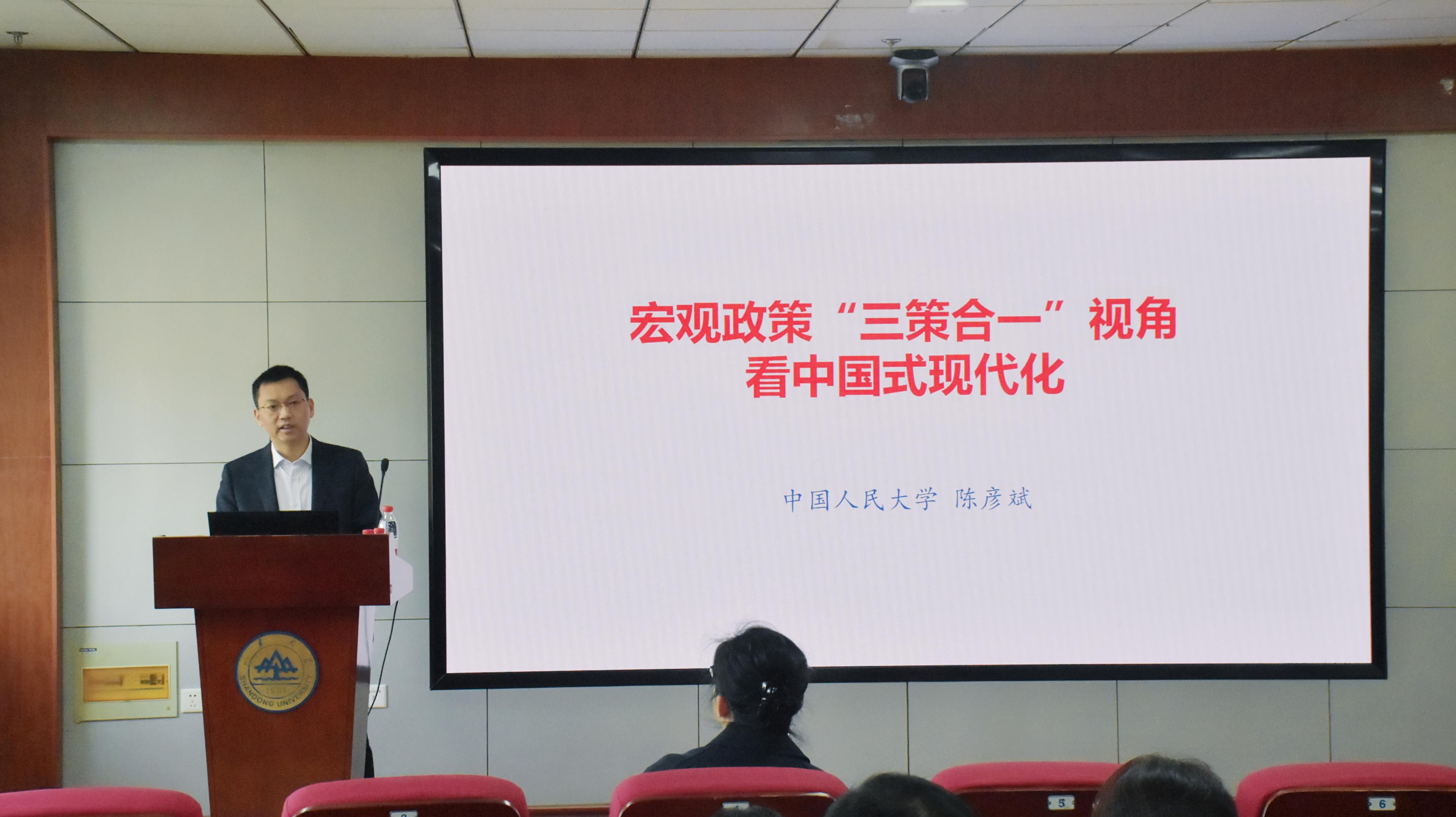 2023年3月18日,tyc41183太阳成集团“公共经济学与公共政策名家讲坛”第二期在中心校区知新楼B423聚贤报告厅举行,中国人民大学二级教授陈彦斌作了题为“宏观政策‘三策合一’视角看中国式现代化”的报告。讲坛由tyc41183太阳成集团副院长张群姿主持,部分师生参会。
