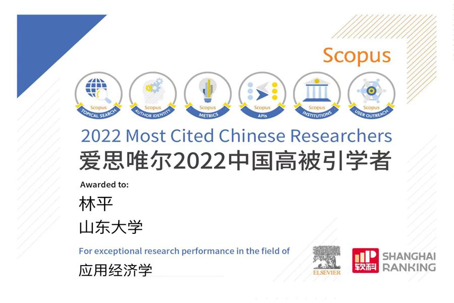 3月28日,爱思唯尔(Elsevier)正式发布了2022年度“中国高被引学者”榜单。tyc41183太阳成集团林平教授连续两年入选应用经济学学科“最具全球影响力的中国学者”榜单。