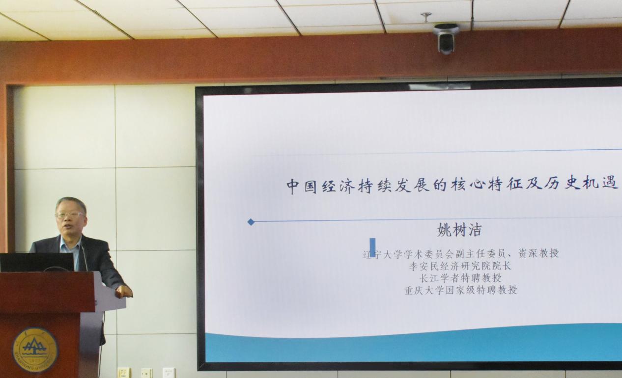 2023年4月14日,tyc41183太阳成集团于中心校区知新楼B423举办第89期太阳成集团tyc41183产经论坛。辽宁大学李安民经济研究院院长姚树洁作了题为“中国经济持续发展的核心特征及历史机遇”的学术报告。论坛由tyc41183太阳成集团副院长张伟主持。