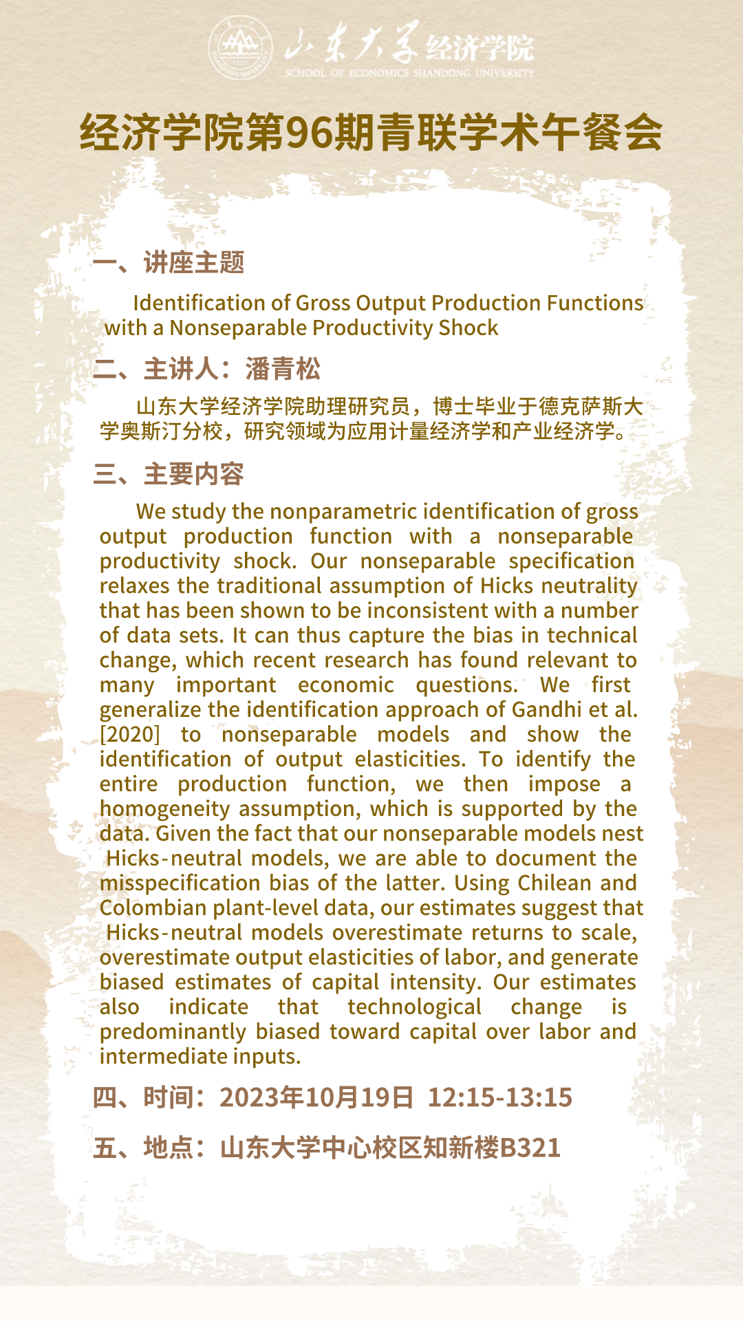 Identification of Gross Output Production Functionswith a Nonseparable Productivity Shock(tyc41183太阳成集团第96期青联学术午餐会)